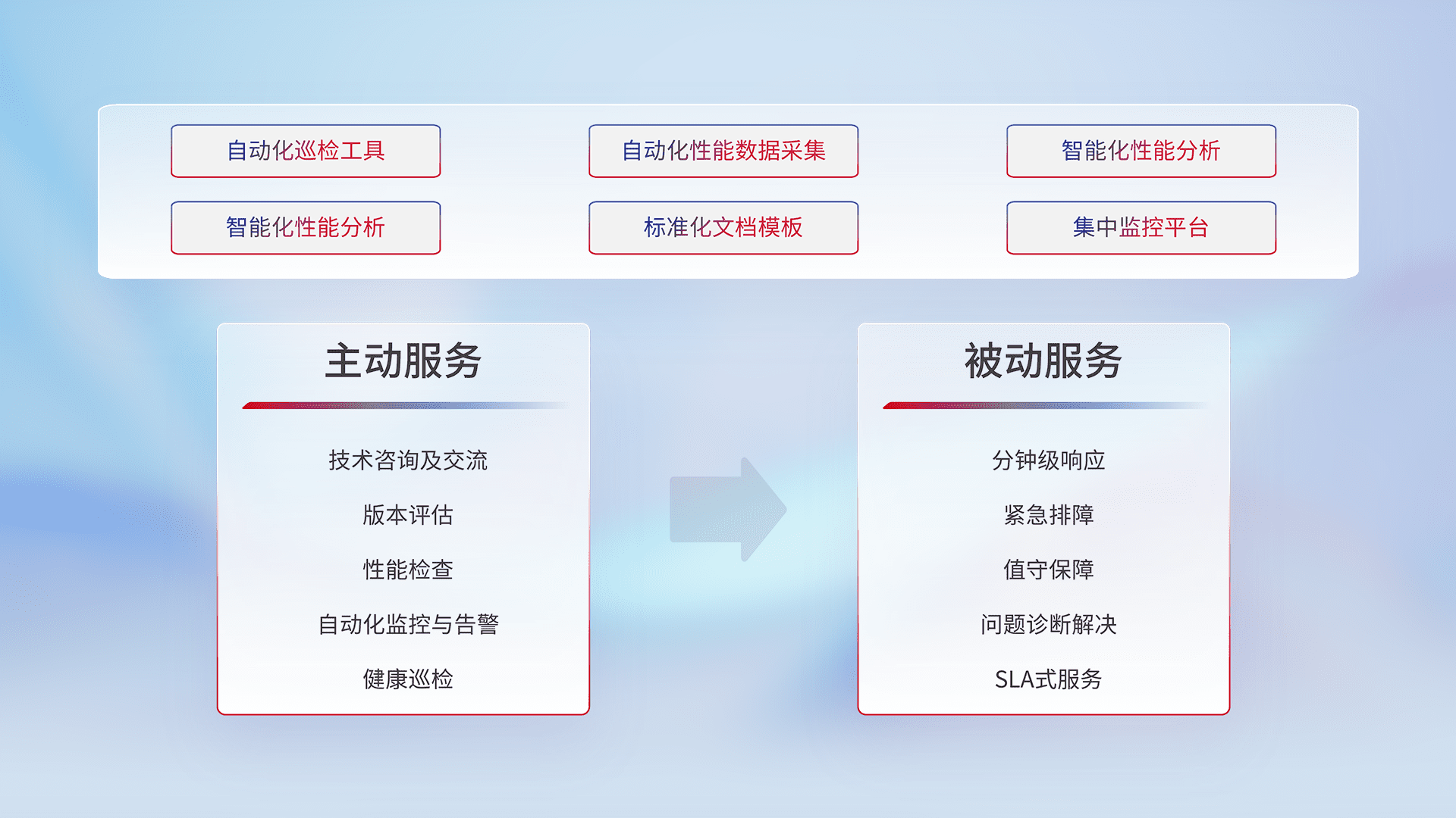 智能化工具和标准化文档,,保障服务质量,,,,提供主动服务(包含技术咨询、、、、版本评估、、、性能检查、、、、自动化监控与告警、、健康巡检)和被动服务包含(分钟级响应、、、紧急排障、、值守保障、、、问题诊断解决、、SLA服务)。。。。