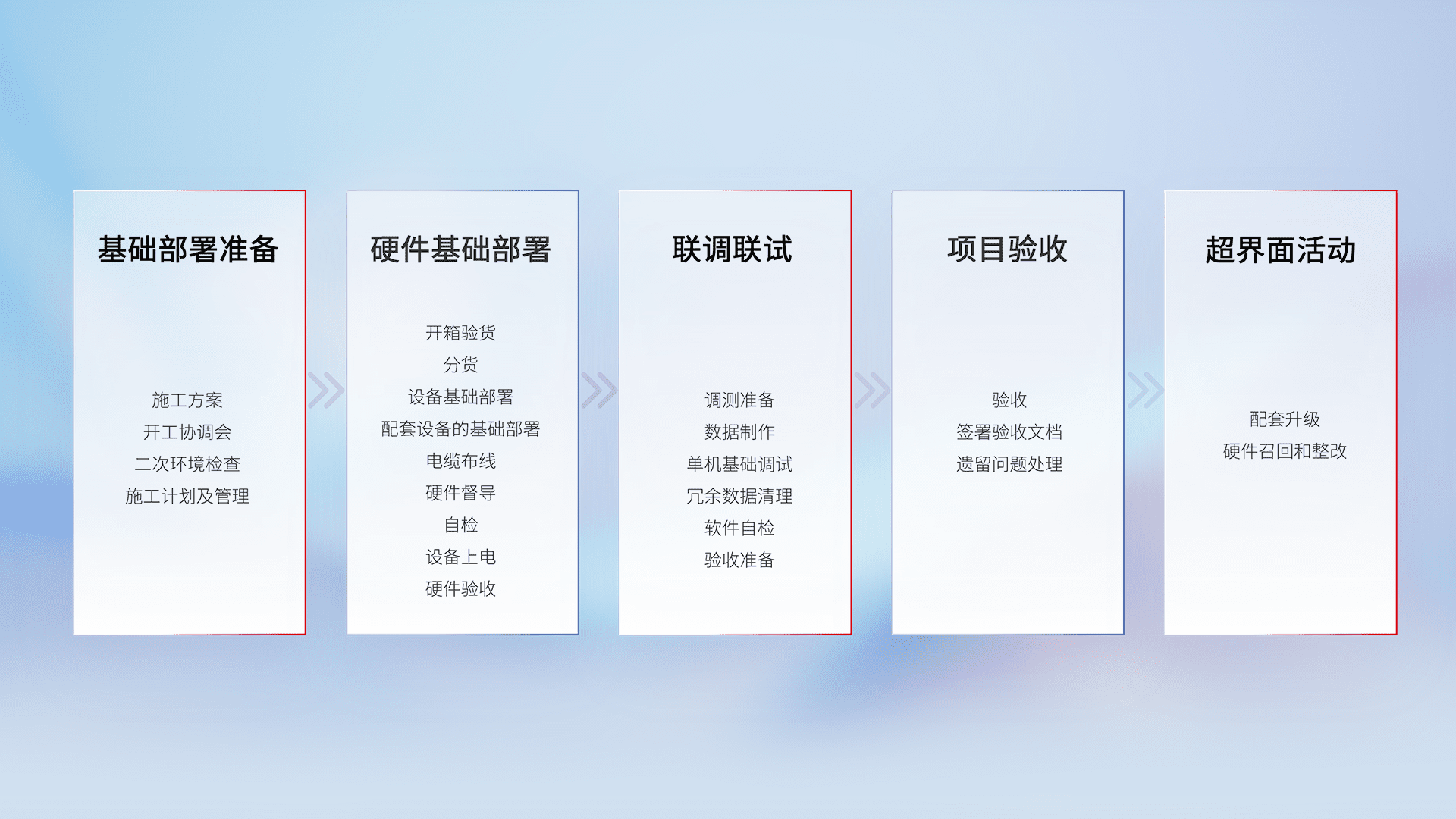 从基础部署准备、、、硬件基础部署、、、、联调联试、、、、项目验收、、越界面活动的全过程可追溯,,保证施工质量和进度。。。